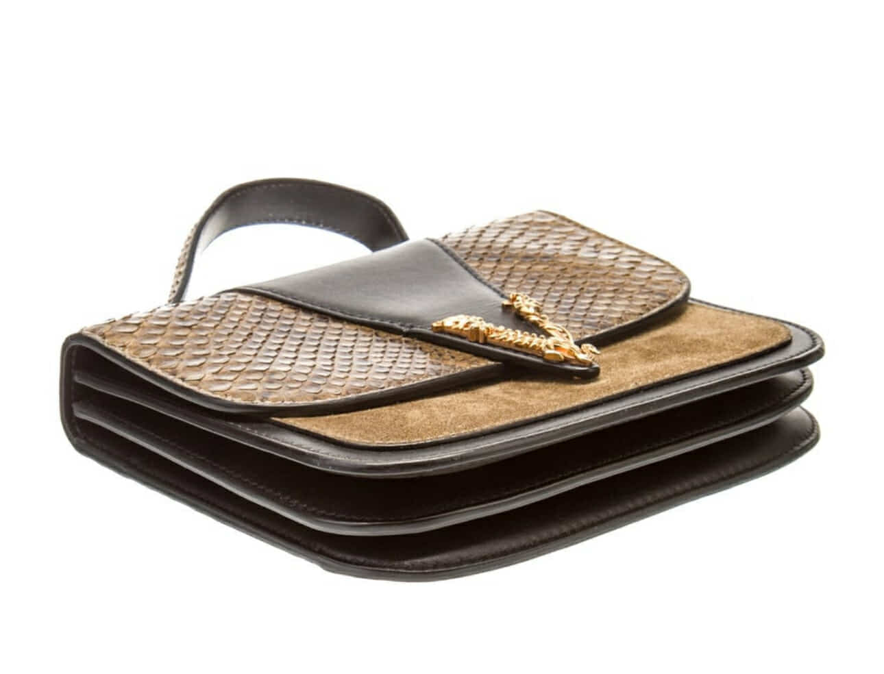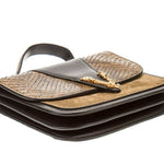 Gold Tone hardware and black leather with animal print - this bag goes with all seasons! Leather lining and single interior pocket. Snap closure at front and AB rating condition!