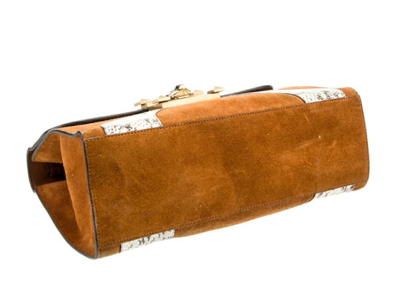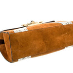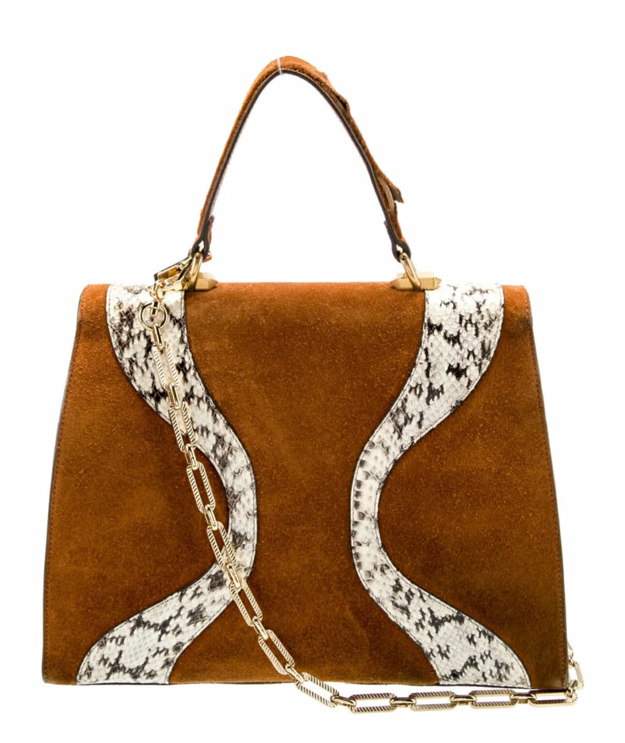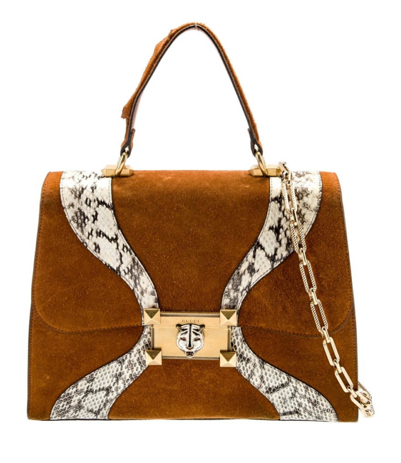 GUCCI Top Handle Bag with Brown Suede and animal print. Feline head accent and gold toned hardware. Leather and snakeskin trim! Crystal and chain link accents with push lock closure at front and three interior pockets.